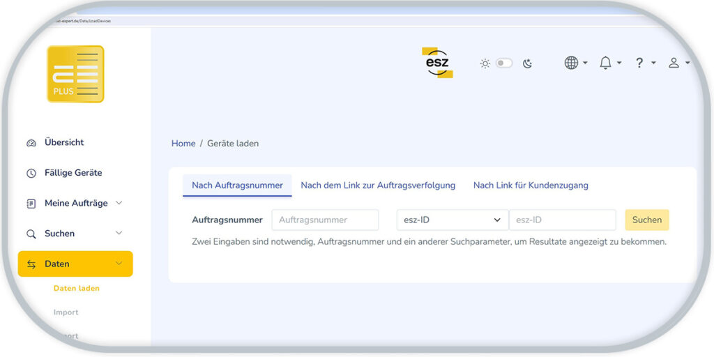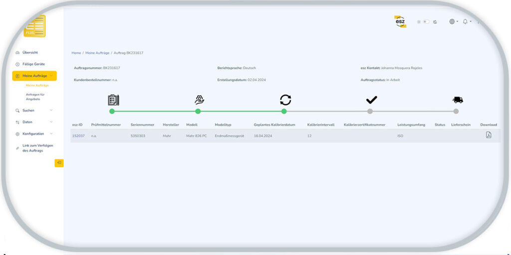 Die Auftragsübersicht gibt Ihnen einen Überblick zum aktuellen Status der Prüfmittel bei der esz AG. Mit der Versandinformation erhalten Sie Zugang zu den Aufträgen und mit der Trackingnummer verfolgen Sie den Weg Ihrer Pakete bei der Rücksendung.