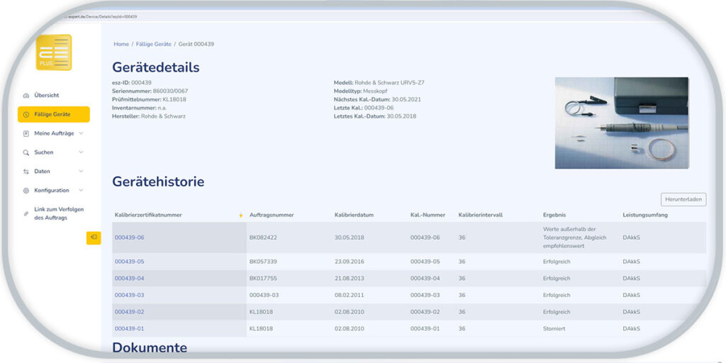 Aktuelle und ältere Kalibrierzertifikate oder Dokumente sind im Handumdrehen abrufbar und stehen zum Download zur Verfügung. aePLUS verfügt zudem über eine praktische Erinnerungsfunktion zur Überwachung wiederkehrender qualitäts- und produktsicherheitsrelevanter Fristen wie z.B. Kalibrierzyklen